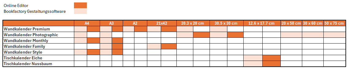 Bookfactory bietet verschiedene Formate für Fotokalender an, einschliesslich Wandkalender, Tischkalender und Jahresplaner: