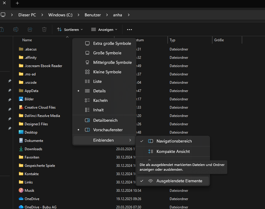 - Klicke im Ordner unter "Anzeigen" / "Einblenden" auf "Ausgeblendete Elemente"