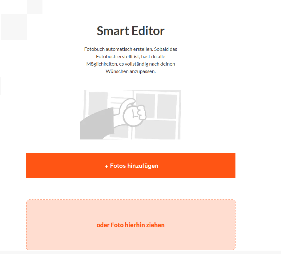 Du kannst dich für den Smart Editor direkt nach Einstieg in den Online Editor entscheiden, wenn es um das Hochladen deiner Fotos geht und du kannst den Smart Editor jederzeit problemlos verlassen und wie gewohnt mit deinem Fotobuchprojekt weitermachen.