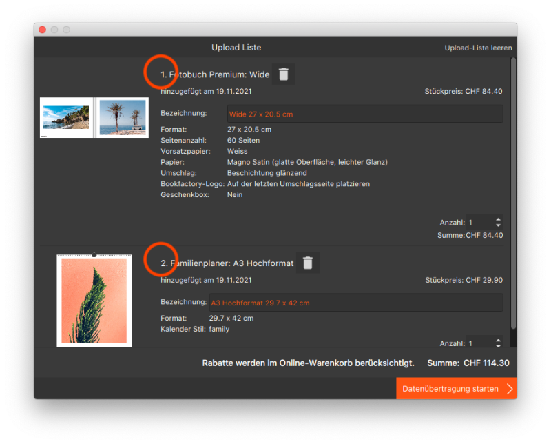 With the Bookfactory design software you can also transfer several products in one order. To do this