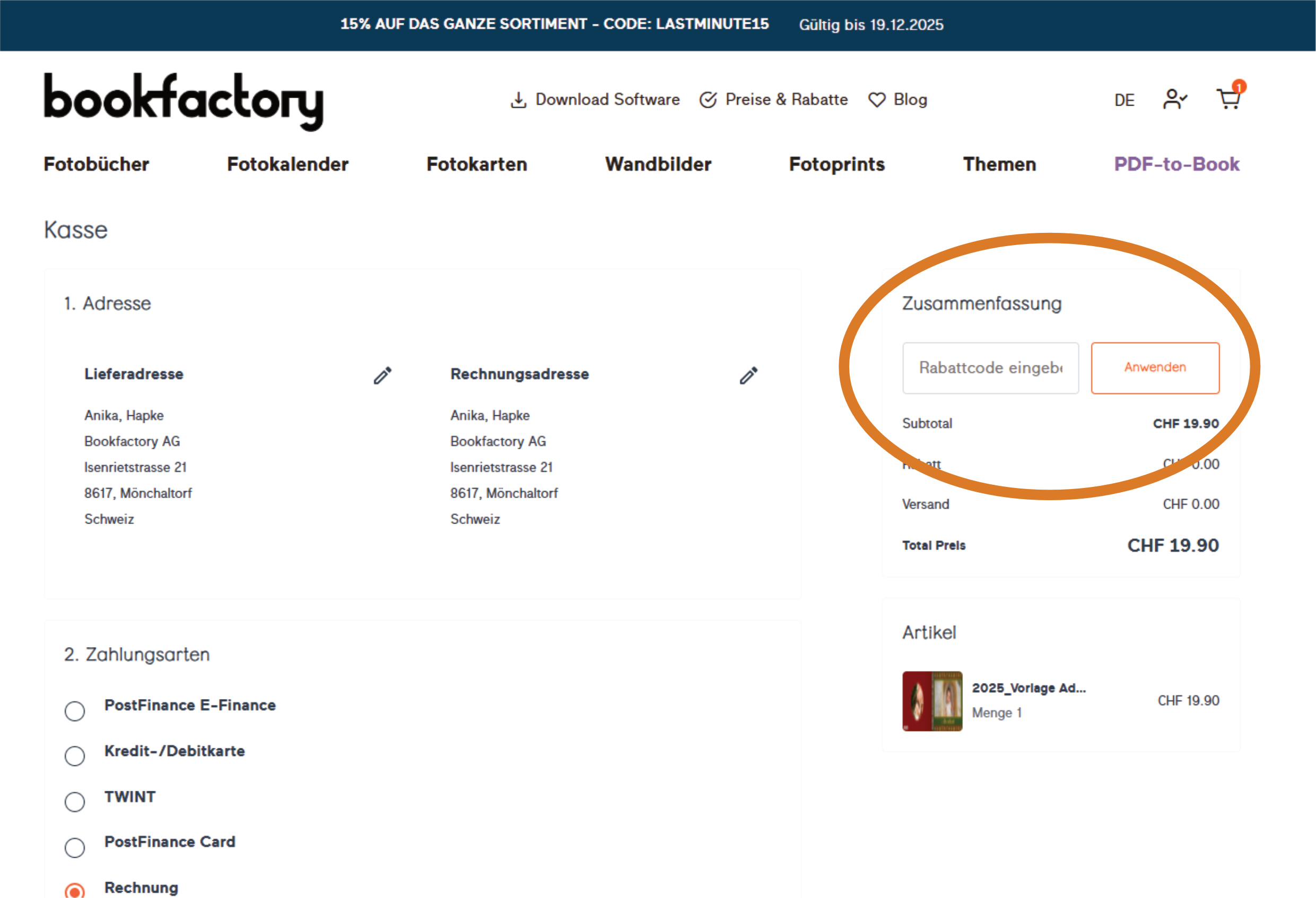 Si tu as reçu un Bookfactory bon cadeau ou si tu veux utiliser un code promo, tu peux le saisir directement dans ton panier. Regarde la capture d’écran ci-dessous pour voir exactement où l’ajouter.